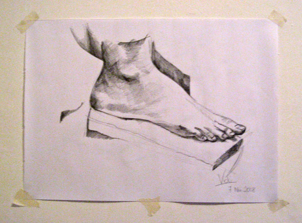 The drawing’s up on my bedroom wall now. It’s definitely not the best study of a foot, but my walls were bare, and I like to remember my stormy afternoon in the Ecuadorian Art Centre.