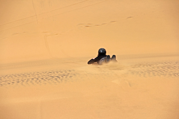 Strapping my boots to the board, Pally, reiterated his instructions. “Trust me! Trust me!” he repeated endlessly. He gave a little push… and I wobbled down the slope… without falling over. This was great. I was sandboarding!